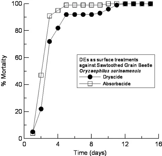 Efficacy of the three DEs was tested against the major coleopterous pests of stored grain including: