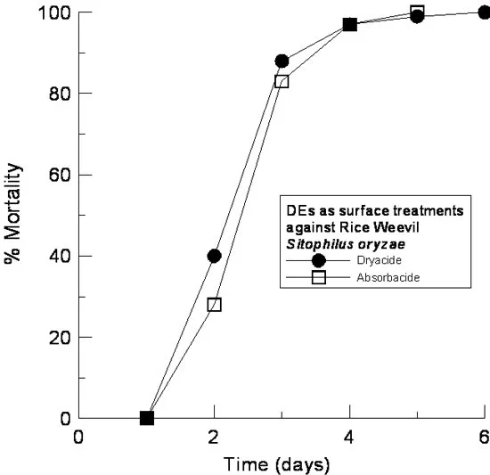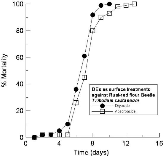 20 adult test insects were confined to concrete surfaces (56.74 cm 2 discs) treated with one of the test DEs at the intended label rate of 2 g/m 2 or to untreated concrete surface (control). The mortality of test insects was recorded each day for a period of up to 17 days. The insects were provided with food during the exposure period and the experiments were maintained in constant conditions of 25 oC and 55% relative humidity. Each treatment was replicated 5 times. Results are reported as mean % mortality of the 5 replicates at each observation.